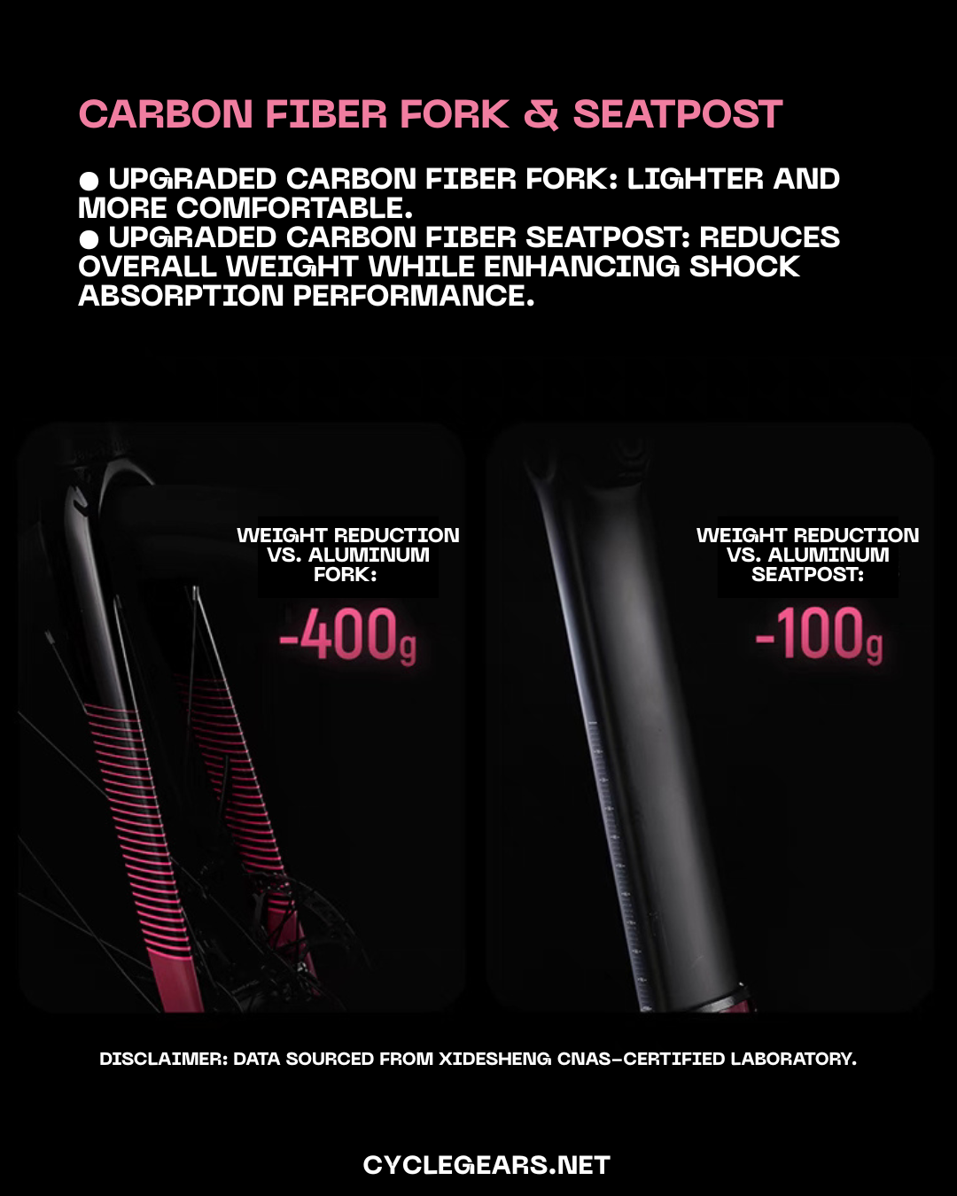 • Carbon Fiber Fork & Seatpost: Upgraded fork (400g lighter) and seatpost (100g lighter) improve shock absorption and riding comfort.