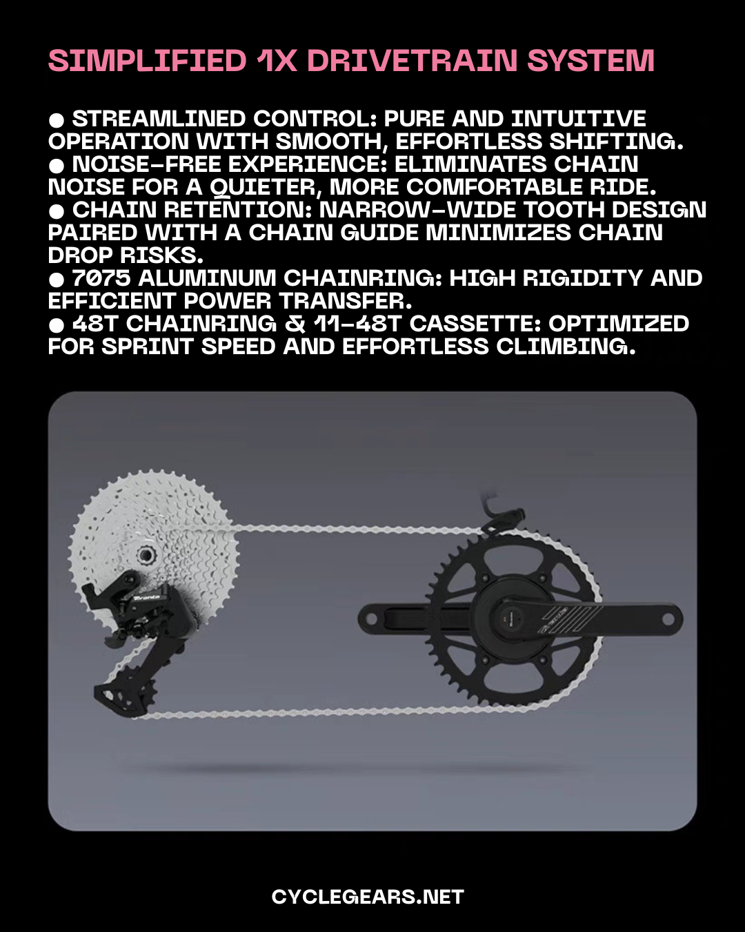 • 1x Drivetrain System: Simplified single-chainring design eliminates chain noise and ensures stable shifting. 7075 aluminum alloy chainring offers high strength and power transfer efficiency.
